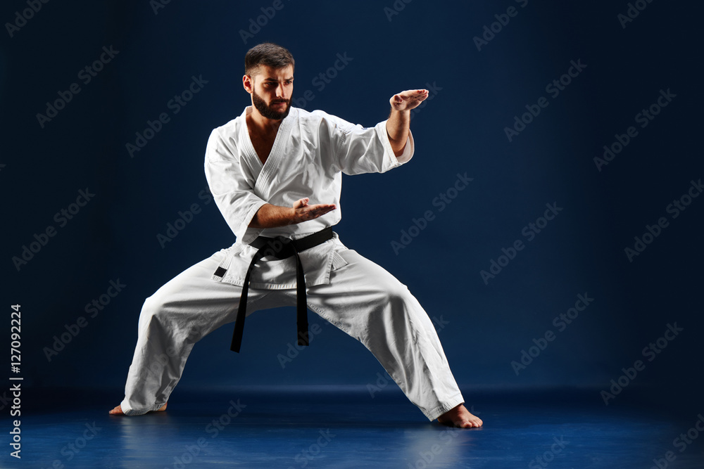 Karate Man In A Kimono Standing In A Fighting Stance On A Blue Background Stock Photo Adobe Stock